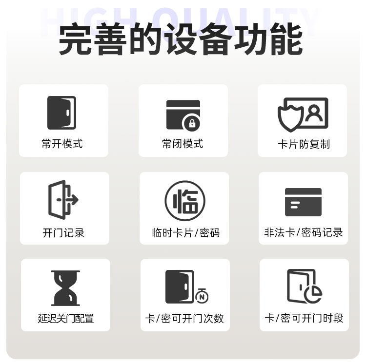 德阳这款智能门锁提供室内门锁和防盗门锁两种选择,其中室内门锁尺寸为 2806521mm,适配 5050 锁体;防盗门锁尺寸为 3657021mm,适配 6068 锁体,可满足不同场景的安装需求。它采用铝合金一体成型搭配钢化玻璃面板打造,兼具坚固耐用的品质与简洁美观的视觉效果。门锁支持蓝牙无线通讯,解锁方式丰富多样,密码、卡片、蓝牙、钥匙四种方式随心选择,满足不同使用习惯与应急需求。其工作温度范围为 - 20~70℃,能适应多数地区的气候条件,采用碱性电池供电,安装更换便捷,是兼具安全性与实用性的门锁选择。